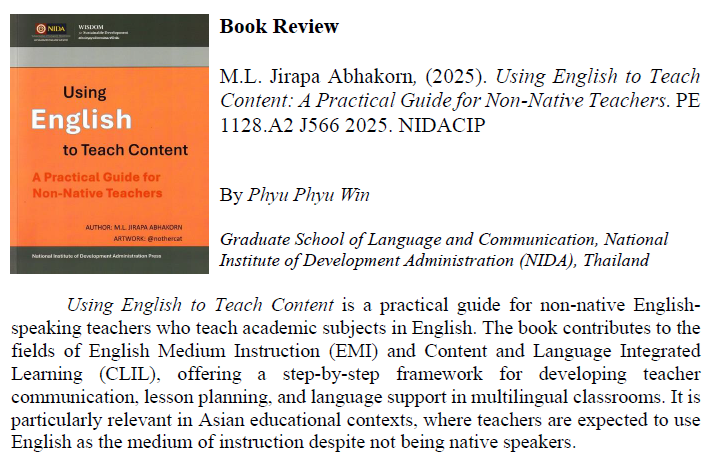 NIDA Journal of Language and Communication, (NIDAJLC), ranked in the Second tier (1 January 2025 - 31 December 2029) of the Thai Journal Citation Index (TCI), is a double-blind peer-reviewed journal of the Graduate School of Language and Communication, National Institute of Development Administration. This journal aims to disseminate information of interest to language and communication scholars, language teachers, and students as well as others interested in related interdisciplinary sciences. Published biannually (January - June and July - December), NIDAJLC encourages the submission of original research articles, academic articles, and book reviews on topics of significance to linguistics, applied linguistics, sociolinguistics, language teaching and learning, discourse studies, translation studies, cultural studies, gender studies, and communication.